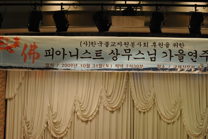 사단법인 한국불교자원봉사회를 후원하기 위하여 상무스님이 로도사음악단원들과 함께 2009년 10월 31일 7시 30분에 국제신문 4층 대강당에서 음악회를 개최하였습니다. 예상밖의 많은 관객이 모여서 성황을 이루었습니다. 상무스님이 이끄는 로도사 음악단원과 한국불교자원봉사회 회원 및 참석하신 모든 분들께 감사드립니다.
