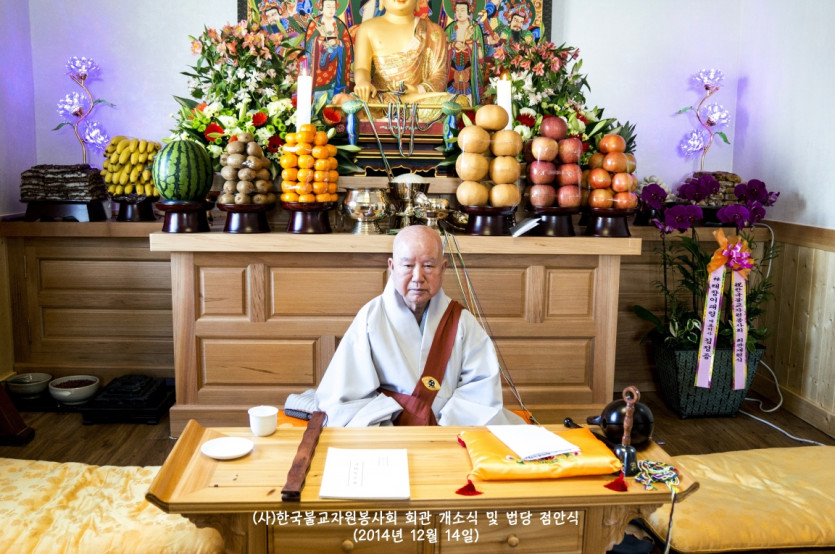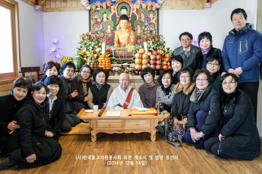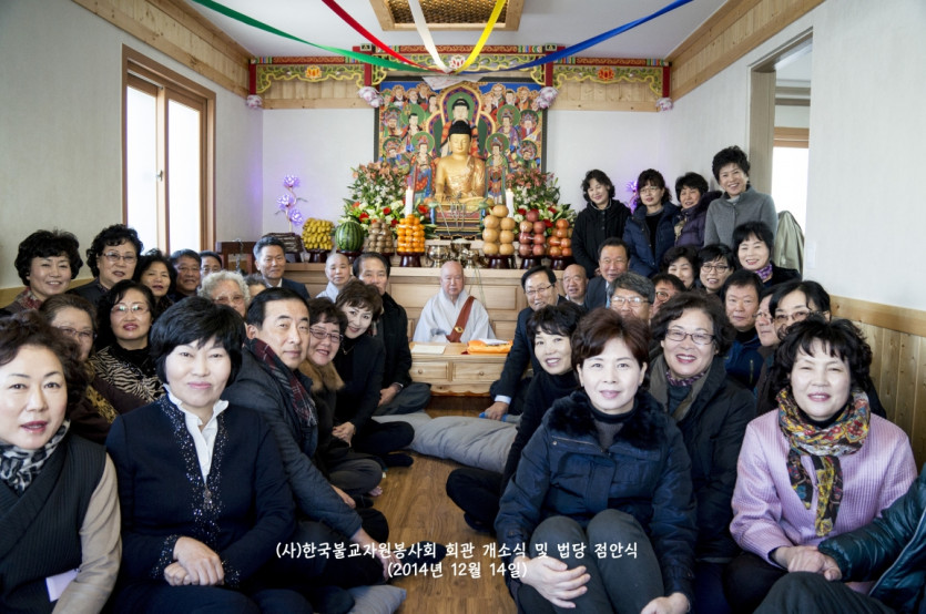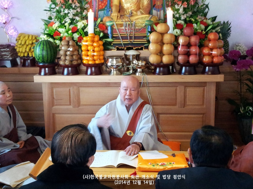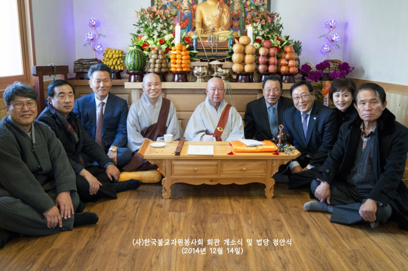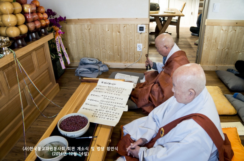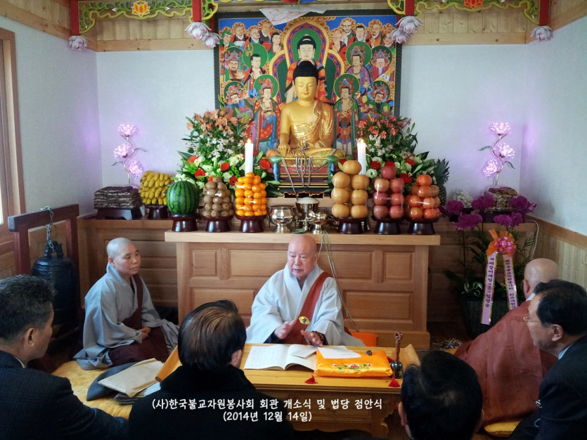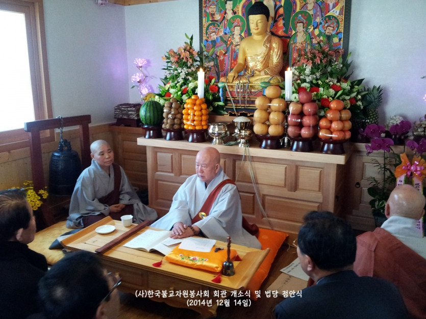 2014년 12월 14일 드디어 (사)한국불교자원봉사회가 터를 잡고 영주암 정관큰스님을 증명법사로 모시고 법당점안식과 개소식을 거행하였습니다. 그야말로 비로소 우리의 근본을 나타내기 시작한 것입니다. 장석준이사장님을 비롯하여 회원님들의 적극적인 참여로 일구어낸 소중한 터가 되었습니다. 그간 물심양면으로 수고하신 분들께 진심으로 감사드리며, 회원님 여러분의 가내에 부처님의 가피가 가득하길 기원합니다. 그날의 모습을 이곳에 올립니다. 감사합니다.