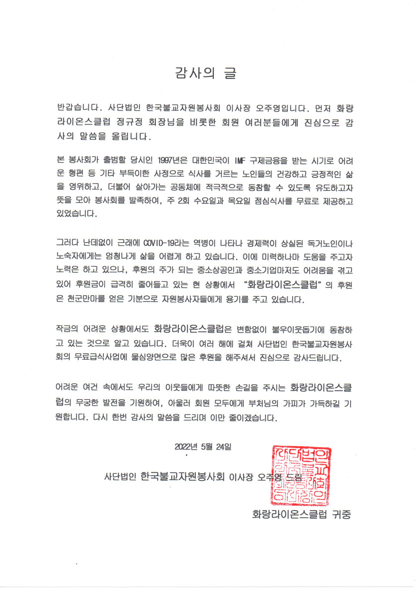 2022년 5월 24일 부산화랑라이온스 클럽에서 많은 후원금과 함께 무료급식봉사활동을 하였습니다